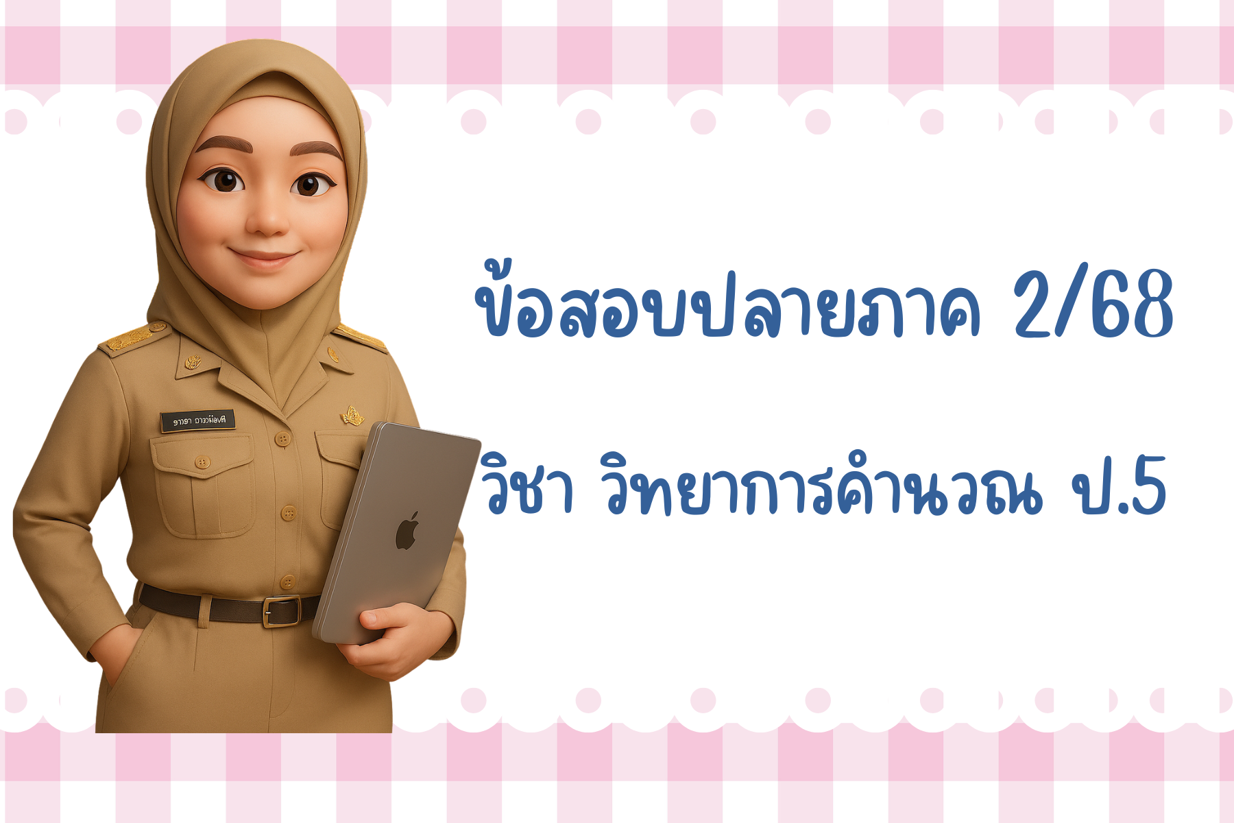 แบบทดสอบปลายภาคเรียน วิชาวิทยาการคำนวณชั้นประถมศึกษาปีที่5 ภาคเรียนที่ 1 ปีการศึกษา 2568 เป็นข้อสอบปรนัย จำนวน 20 ข้อ 20 คะแนน / ข้อสอบอัตนัย จำนวน 2 ข้อ 10 คะแนน เวลา 1 ชั่วโมง